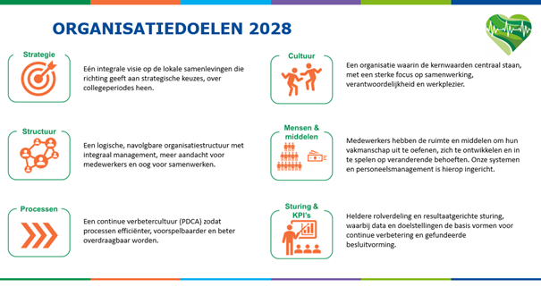 In maart 2024 is het programma ‘organisatieontwikkeling’ gestart. De in 2024 aan de raad gepresenteerde strategie, met daarin de doelen voor de komende vier jaar, schetst een beeld van de gewenste organisatie in 2028. Met activiteiten en projecten geven we vorm aan deze verandering.